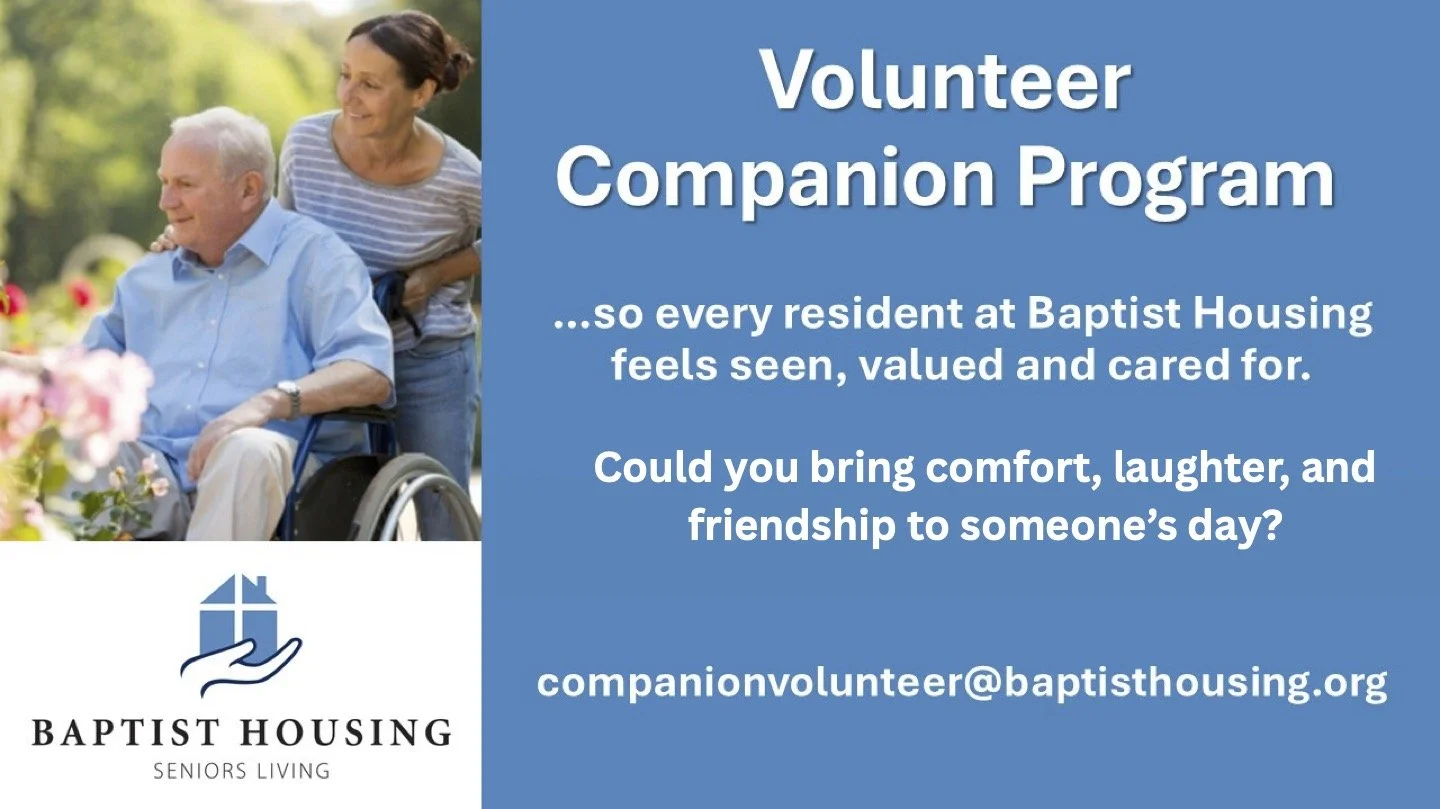 Through the “Volunteer Companion Program” we are seeking mature adults who will commit to visiting at least one person on a regular basis in a Baptist Housing Community. The purpose of these visits would not be to be a counselor or provide medical or personal care. The purpose is simple ongoing connection. We want people to know that they are valuable and cared for. Could you be the person to show God’s love in this way?